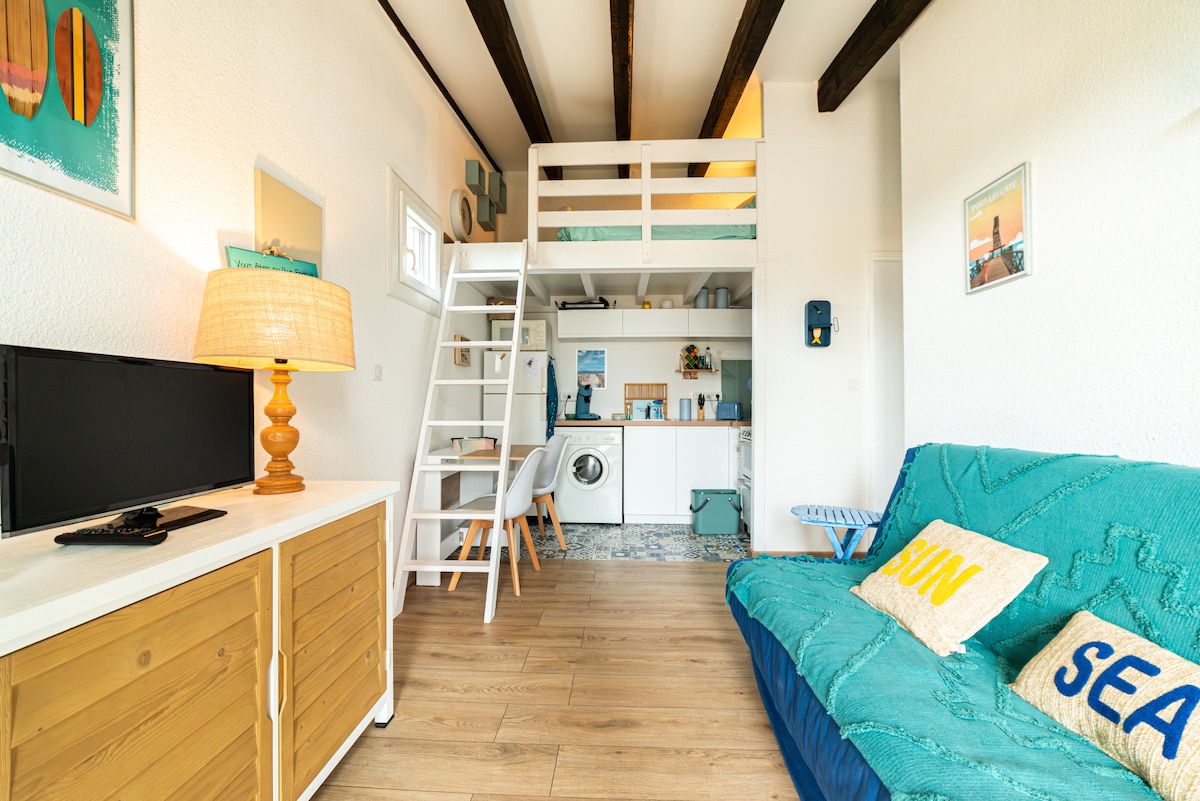 Logement situé au 1er étage sur 1 dans résidence calme avec place de parking attitrée et grande terrasse. A 100 m des premiers commerces de proximités, à 2 minutes de la plage à pied. Équipé du Wifi, d'une climatisation, d'un lave linge, d'un frigo congélateur, d'un four micro onde, d'une grande Télé avec Chromecast. Il dispose d'une chambre avec un lit double neuf et très confortable ainsi qu'un dressing, un canapé convertible dans le séjour. Idéalement placé et entièrement refait à neuf.