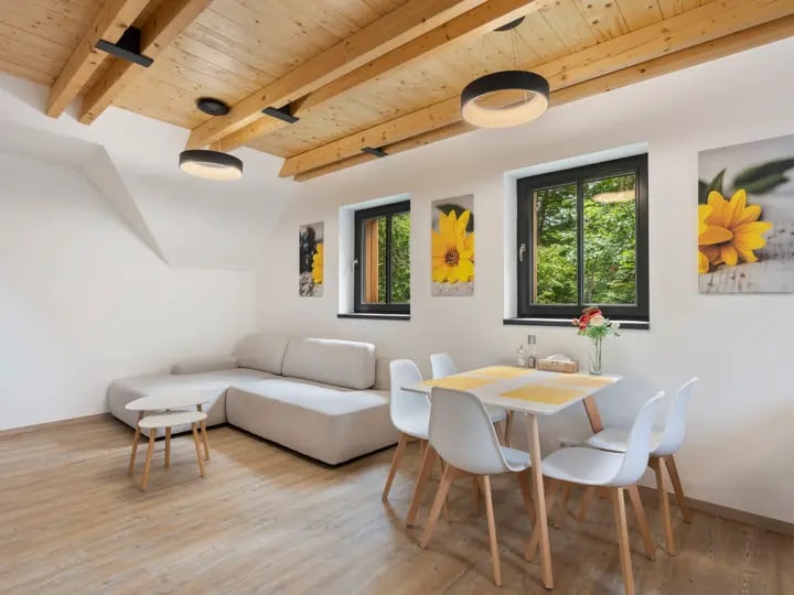 Luxusní mezonetový apartmán pro velkou rodinu nebo skupinu přátel. Není bezbariérový. Pokud si chcete vařit, je zde prostorná kuchyň s velkou pracovní plochou a běžným vybavením. Ve dvou ložnicích se vyspí celkem 6 osob. V první ložnici jsou dvě manželské postele a ve druhé ložnici v podkroví dvě samostatné postele. V obývacím pokoji je rozkládací pohovka s možností přistýlky. V apartmánu jsou dvě toalety - jedna na každém patře a samostatná koupelna se sprchovým koutem je v prvním patře.