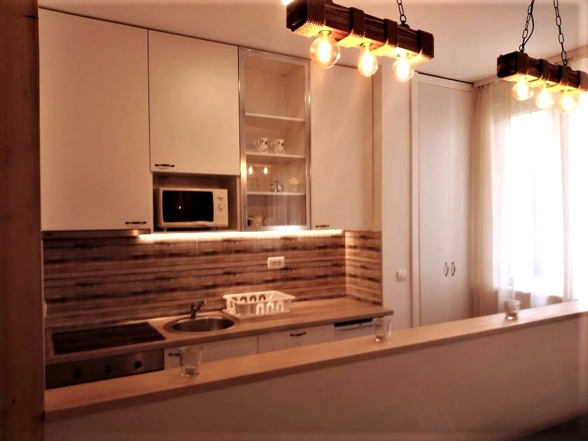 O apartamento está totalmente renovado há alguns meses e tudo está novo em folha. No quarto há uma cama de casal grande e confortável e um sofá-cama grande na sala. Tudo em luz LED discreta. Na cozinha você pode desfrutar de um moderno fogão de tela plana, forno, geladeira com freezer, máquina de lavar louça e máquina de lavar roupa e uma grande mesa de bar. O banheiro é envidraçado com cerâmica de mármore, é muito compacto e limpo. O banheiro está equipado com secador de cabelos, toalhas, conjuntos de higiene.