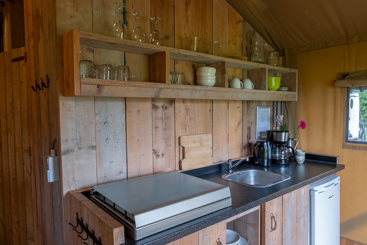 Nossas tendas Forest Ranger são adequadas para toda a família e têm dois quartos, cada um com duas camas confortáveis. Na aconchegante cozinha/sala de estar, você encontrará um fogão para as noites mais frias, um fogão a gás, geladeira, máquina Senseo, chaleira e água corrente fria. Claro, os utensílios de cozinha, talheres, louças e panelas necessários também são fornecidos.
