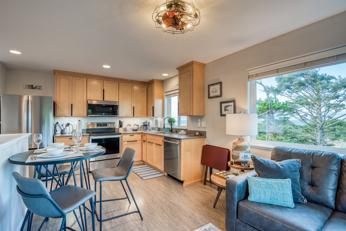 Retiro espaçoso e tranquilo de 2 quartos/2 banheiros com vista para a Baía de Siletz se fundindo com o oceano, oferecendo vistas para a natureza. Experimente um ambiente sereno enquanto os pássaros deslizam sobre a água. Relaxe perto da lareira real com uma xícara de café. Caminhe convenientemente até restaurantes, lojas e carrinhos de comida nas proximidades. Desfrute de uma vista para a praia a partir da janela. Os arranjos para dormir incluem 2 camas Queen size e uma cama dobrável Twin. Quarto principal com um 2º banheiro adjacente ao 2º quarto. Inclui 1 vaga de estacionamento reservada, com vagas extras disponíveis.