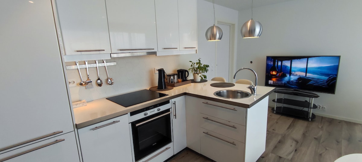 Apartamento ensolarado e aconchegante para alugar em Mandal idílica. Alto padrão, e tem uma bela vista. Bom terreno para caminhadas nas proximidades. O apartamento é composto por 1 quarto, 4 camas. Totalmente bom para 2 adultos e 1-2 crianças em um sofá-cama. Cozinha/sala de estar aberta. O banheiro está equipado com aquecedor, chuveiro, máquina de lavar roupa e secadora. Roupa de cama e toalhas estão incluídas. Equipamento de cozinha, serviço, forno, micro-ondas, chaleira elétrica, geladeira com freezer, máquina de lavar louça e máquina de lavar roupa. Smart TV. Estacionamento gratuito