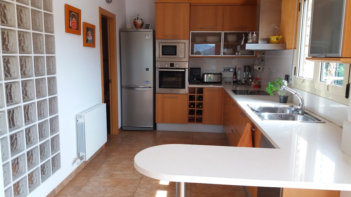 Moradia espetacular com vista para as montanhas de 180 m2 e 900 m2 de jardim localizada numa zona muito tranquila. Casa espaçosa e luxuosa, com muita luz, móveis funcionais e modernos e internet Wi-Fi. Terraço coberto em forma de um arco muito grande de 40 m2 para comer e com churrasqueira. Sala de jantar de 30 m2 com TV Uma cozinha muito grande e totalmente equipada de 25 m2 com lareira, televisão e máquina de lavar louça Jardim em frente à casa e atrás de 900m2 de flores e palmeiras