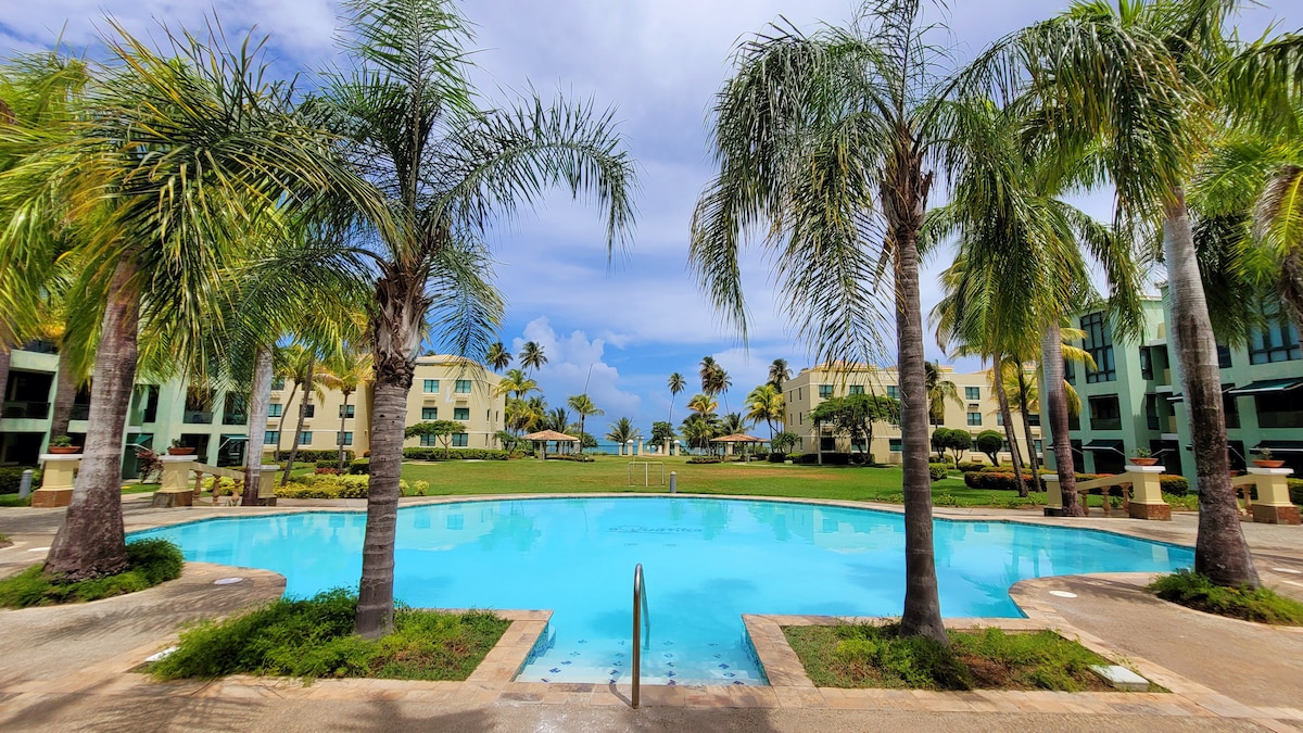 This is a charming tropical apartment in Puerto Rico's favorite family resort style complex with 5 swimming pools, a jacuzzi, heated infinity pool with beach view, water slides, lazy river, mini golf, soccer, volleyball, basketball, playgrounds, tennis courts, outdoor barbecue grills & so much more. The beach is walking distance from the apartment with a special key to enter and exit the beach. The apartment is on the second floor right in front of the lazy river. Perfect view from balcony. 🌴