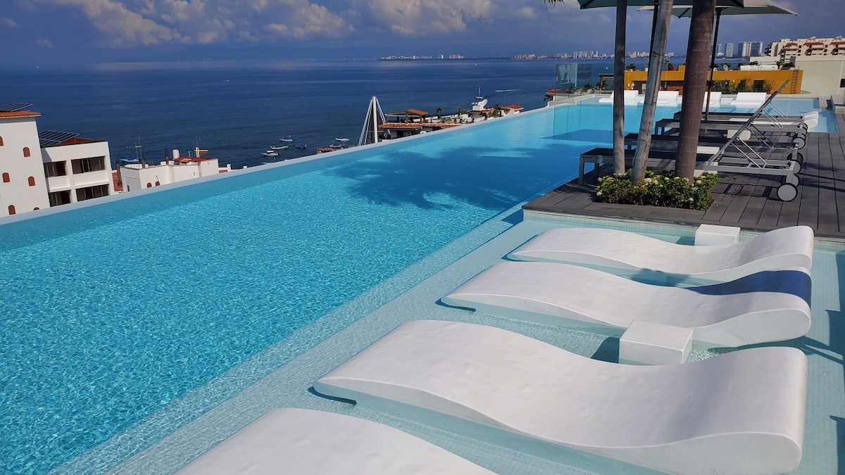***Piscina/banheira de hidromassagem fechada de junho a agosto de 2025.*** Condomínio supermoderno de 2 quartos e 2 banheiros cercado por restaurantes, lojas e vida noturna. Apenas 3 quarteirões da praia, palco cultural e Malecon (calçadão oceânico). Nosso prédio tem uma piscina privada de borda infinita, uma grande banheira de hidromassagem, um lounge no terraço, uma academia de ginástica e segurança 24 horas. O condomínio totalmente equipado tem tudo o que você precisa para se sentir em casa durante sua estadia em Puerto Vallarta. Experimente um dos bairros mais vibrantes e diversos do México.