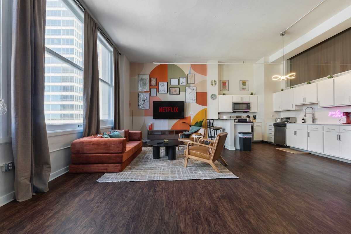 A Galeria é uma suíte de 2 quartos e 1,5 banheiro com vistas incríveis da cidade. Localizado em Illinois e na Market Street, você terá uma vista panorâmica do Monument Circle e do The Arts Garden. Desfrute de uma estadia limpa, espaçosa e privativa enquanto está perto de tudo o que Indianápolis tem a oferecer. Lucas Oil, o Centro de Convenções de Indianápolis, Gainbridge Fieldhouse e restaurantes populares estão todos a uma curta distância. Todas as obras de arte em exibição são provenientes de artistas locais.