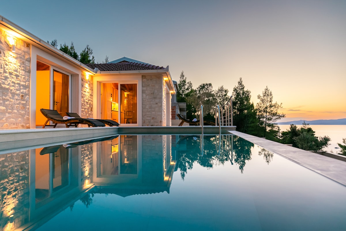 Summer House Bougainvillea is located right above the crystal clear waters of the Adriatic sea. Explore hidden coves by villa's kayak and SUP, or island using 4 bikes (2 electric) swiping through the picturesque vineyards and olive tree roads. Start the day with breakfast on the summer kitchen's terrace, enjoy the dinner on a stunning sea view terrace. Read a book and eat local grapes in your cabana, enjoying the quiet evenings filled by crickets chirping and sea waves melody.