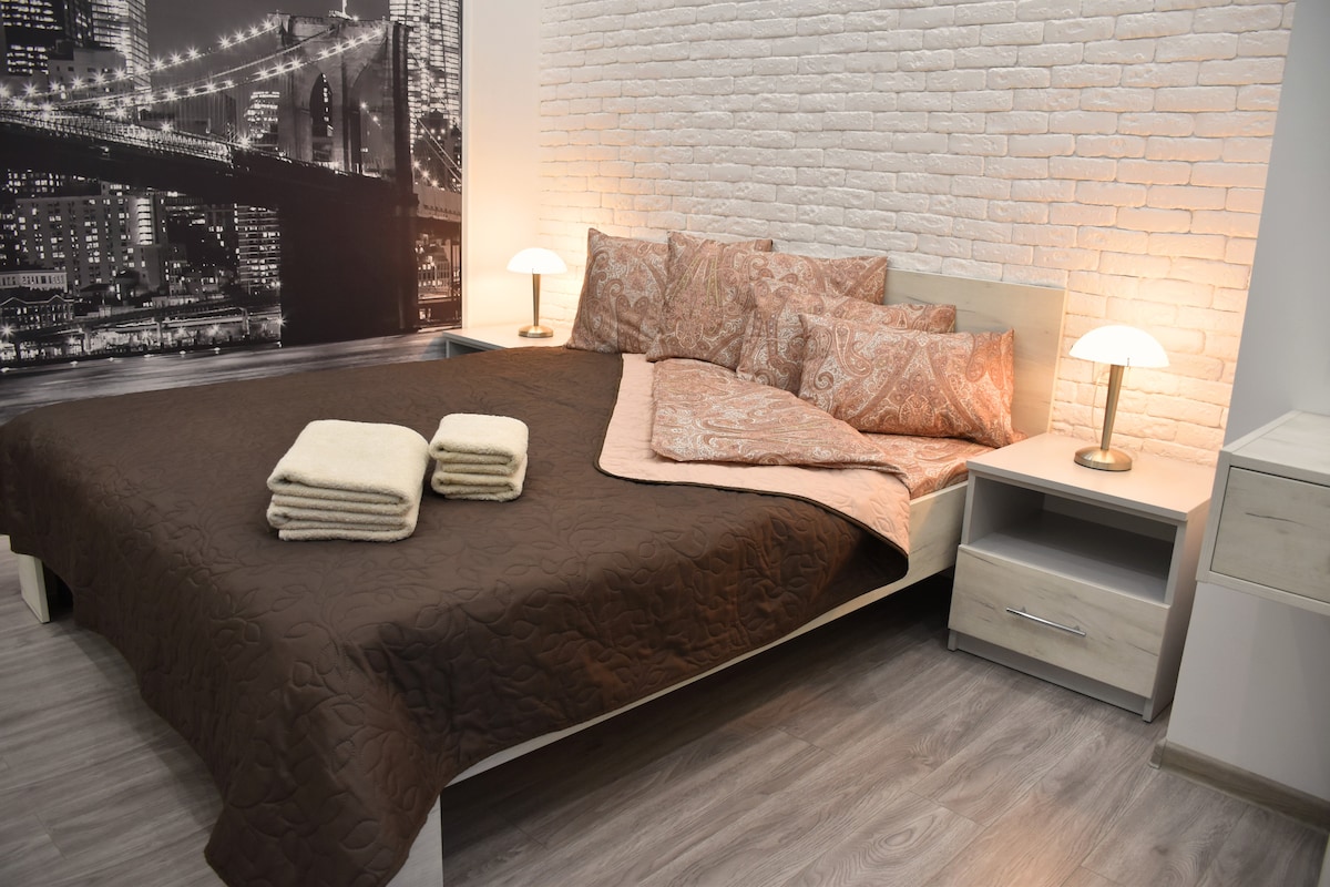 Apartamento elegante de dois quartos no centro da cidade, dois quartos luxuosos com camas de casal, acomodam confortavelmente 4 pessoas. Banheiro com chuveiro. Cozinha totalmente equipada com geladeira, pratos e tudo o que você precisa para cozinhar.