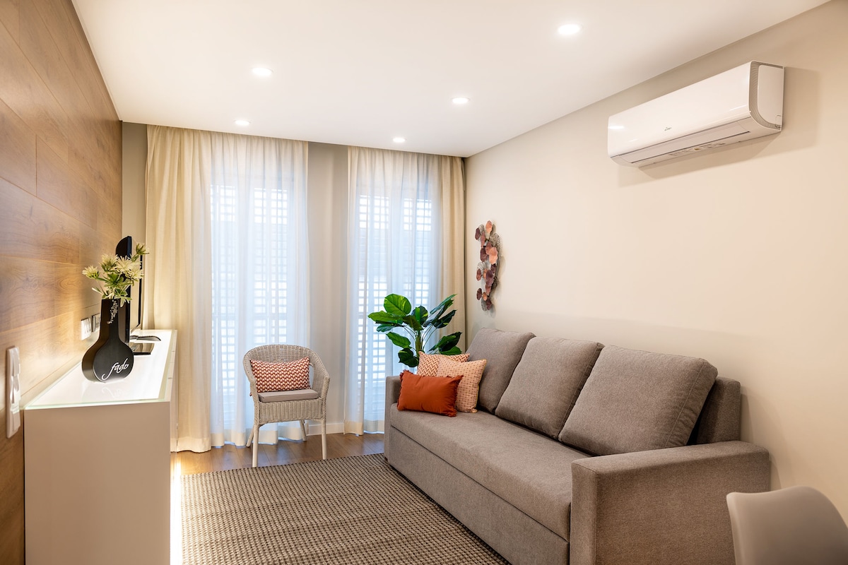 Nosso apartamento aconchegante pode acomodar até 2 pessoas com sua confortável cama de casal. Você vai desfrutar de frescor no verão e calor no inverno graças à unidade de ar condicionado dupla localizada tanto no quarto quanto na sala de estar. O apartamento também está equipado com Internet de alta velocidade, TV a cabo, uma máquina de lavar roupa, uma máquina de lavar louça, placas de indução, um forno e todas as comodidades necessárias para garantir que você desfrute de uma estadia perfeita desde o primeiro dia. Tenha em mente que nosso apartamento tem uma política rigorosa de não fumantes.