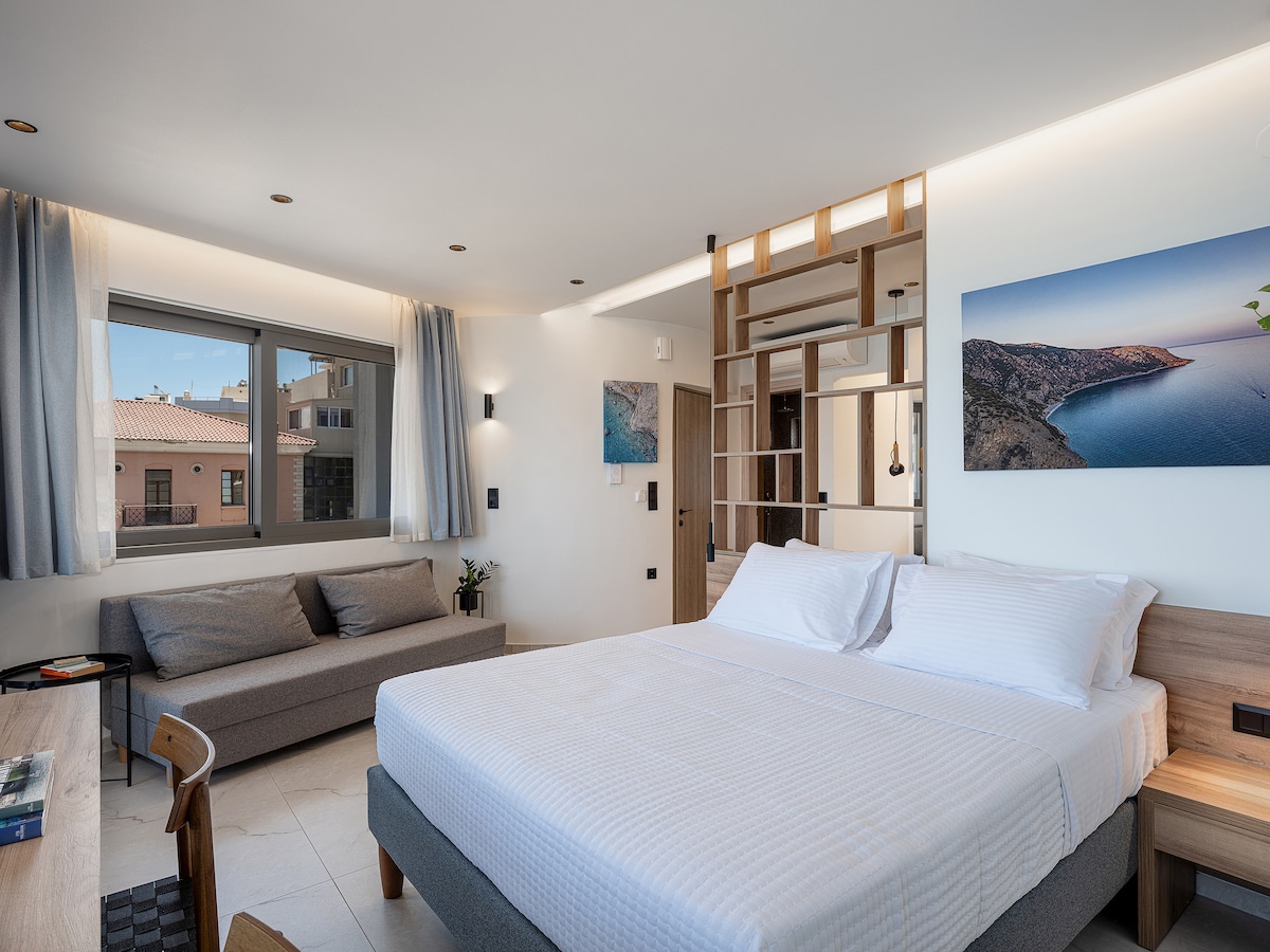 A característica mais apreciada da residência Blossom Collection II é a sua vista. À medida que a porta para a varanda privada da residência se abre, ela revela a vista mais incrível da cidade: o antigo Porto de Veneza, a fortaleza veneziana de Koules e o movimentado litoral de Heraklion. Esta suíte oferece luxo, conforto e comodidades únicas, com uma característica especial sendo o sótão onde o quarto principal e o banheiro principal estão localizados, adicionando um toque de privacidade aos espaços de estar e jantar.