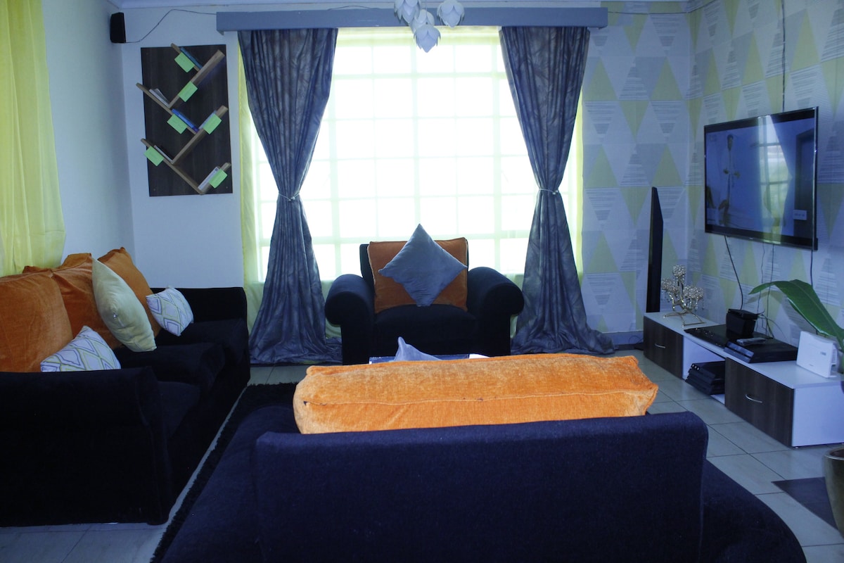Esta casa fica a uma hora do Parque Nacional de Nairóbi. Relaxe e relaxe neste bairro seguro e luxuoso localizado em Kahawa Sukari, fora da superestrada Thika Road. Este Wamara HomeStays oferece: 2 quartos, 2 camas queen size, 1 banheiro compartilhado: adequado para 3/4 hóspedes. Os quartos têm vista para um jardim encantador, uma cozinha completa separada, chuveiro quente, Wi-Fi e smart TVs. Supermercados e restaurantes a uma curta distância a pé; desfrute de caminhadas noturnas com amigos. Há sempre um membro da equipe para recebê-lo na chegada.