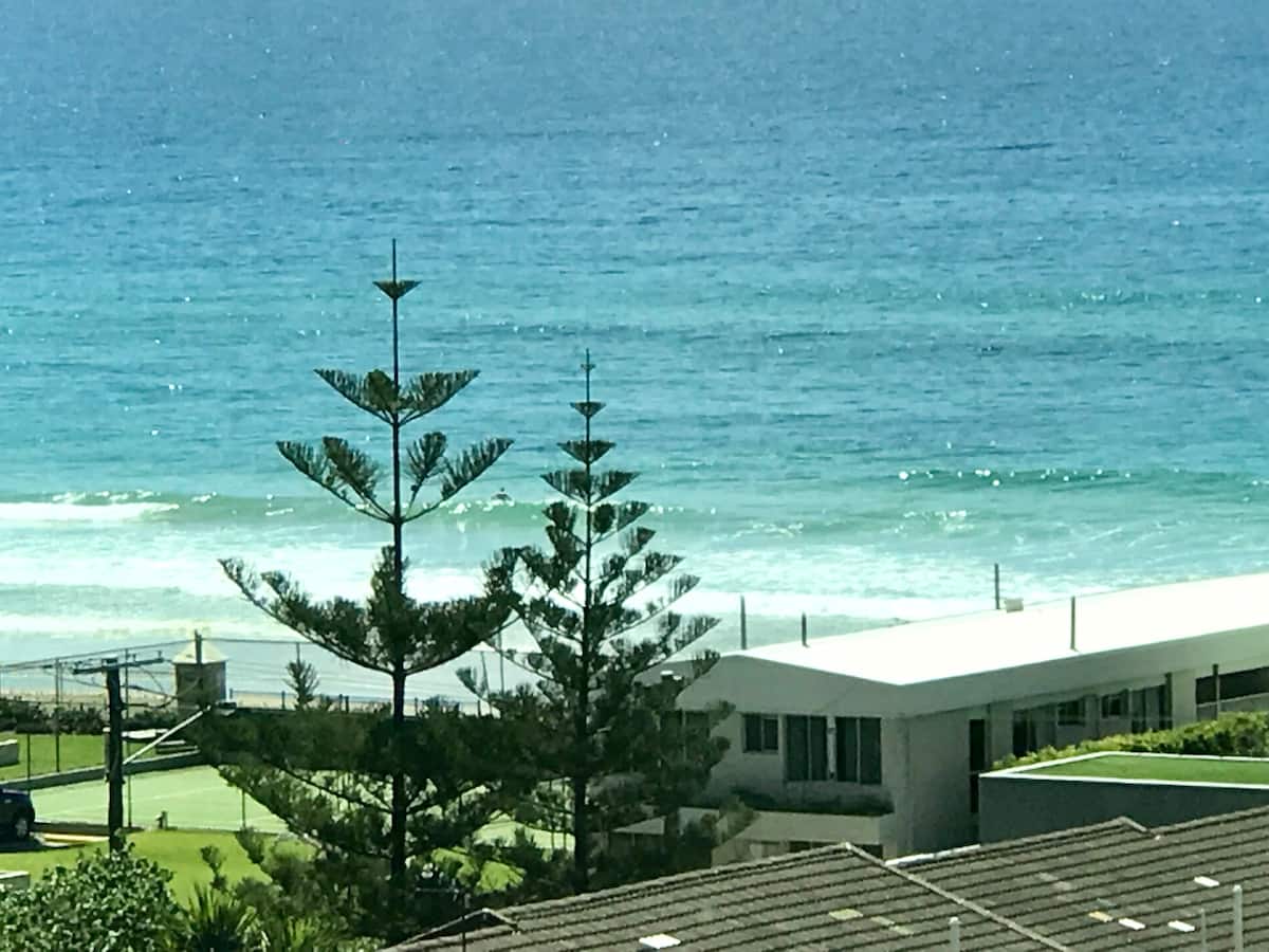Um encantador apartamento estúdio limpo e acolhedor com cozinha, varanda ao ar livre com vista para a praia vigiada do paraíso dos surfistas. TV grande com Netflix e Wi-Fi gratuito ilimitado. A apenas 60 metros da praia e a uma curta distância a pé de toda a vida noturna e compras do paraíso dos surfistas Parada de bonde bem em frente ao hotel para facilitar o acesso a Broadbeach, ao cassino estrela e à feira do Pacífico.