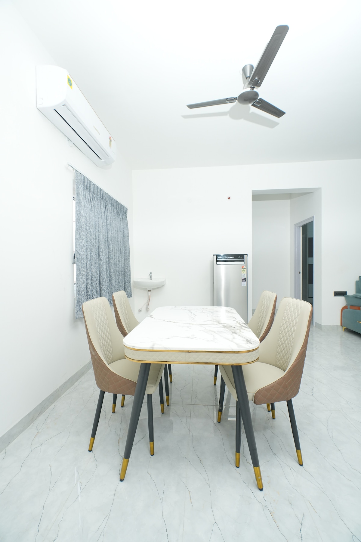 Bem-vindo ao nosso apartamento elegante 3 BHK, perfeito para estadias curtas ou longas. Desfrute de 3 quartos com ar condicionado e banheiros privativos, uma sala de estar aconchegante com uma Smart TV de 43", Wi-Fi de alta velocidade e um balanço interno. A cozinha está totalmente equipada com fogão a gás, micro-ondas, purificador RO, geladeira e utensílios. Relaxe na espaçosa mesa de jantar ou leia nossa coleção de livros. Localizado perto de Hitech City Metro, Rameshwaram Cafe (100m), US Visa Center (1km), Cable Bridge, IT hubs,