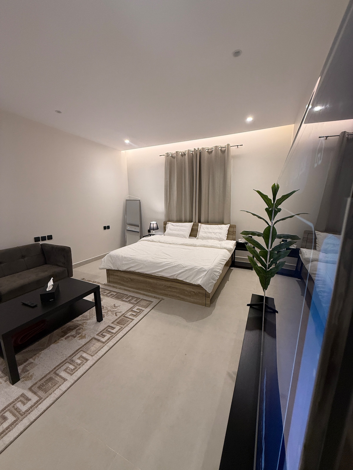 É um apartamento com um quarto, sala de estar, cozinha e banheiro localizado no centro do centro do centro do centro do campus, no centro da área de restaurantes, cafés e com vista para Wadi Al Aqeeq. Fica a 3 minutos de carro da Universidade Islâmica. Ele é projetado em cores confortáveis e um designer moderno. Há uma tela Netflix de 57 polegadas e uma testemunha e apresenta amplo espaço, privacidade completa e entrada inteligente. Desejo-lhe uma estadia feliz e Deus o abençoe, querido hóspede