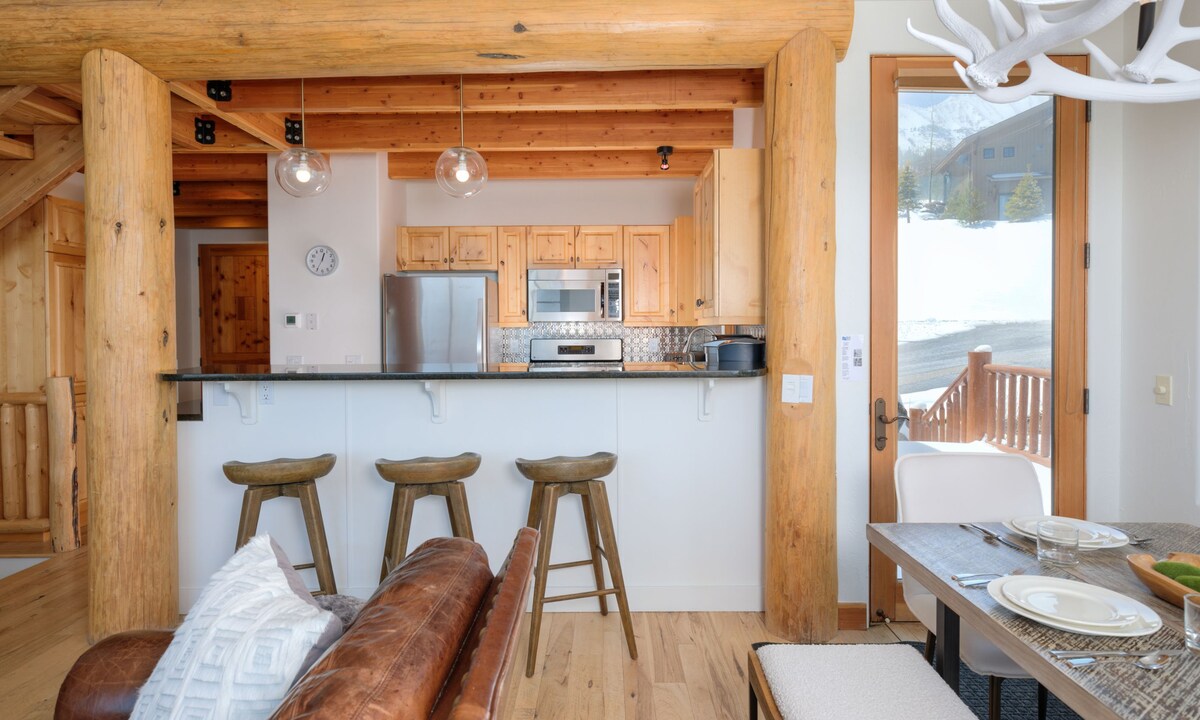 Luxuoso apartamento de aluguel de esqui em Big Sky, Montana. Confortos caseiros. Trilhas de esqui preparadas para os elevadores do resort. Localizado em uma encosta quente virada para o sul da área de esqui Big Sky, com vistas panorâmicas.