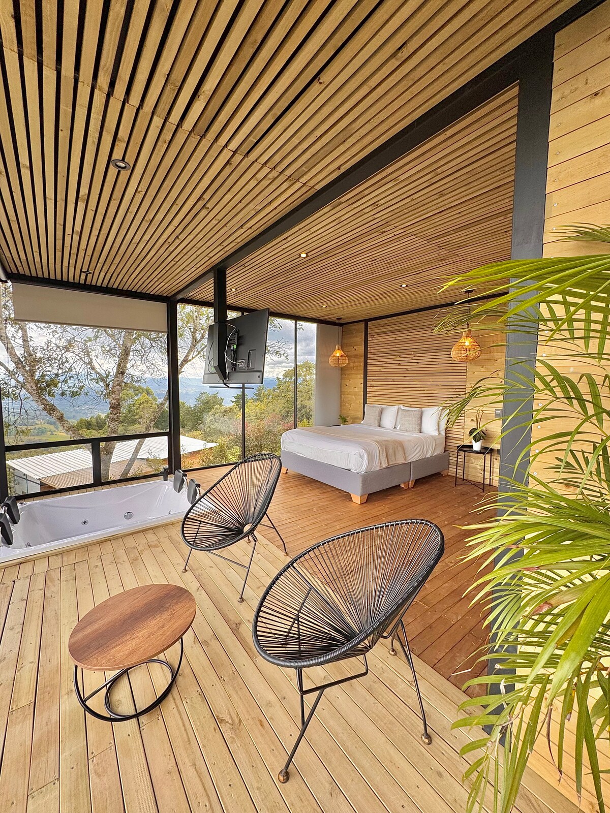 FORESTA is a modern cabin created with love for you to have an unforgettable stay in the middle of nature, with total comfort. Enjoy the privileged views from the deck, chill out in the jacuzzi, watch the dozens of birds that visit us or have a chat by the fireplace in the living room. FORESTA is a great launchpad to explore Guatape, climb the rock and do kayaking, jet-ski, wakeboard, sailing, paraglading, horseback riding, hiking, getting a helicopter ride or having an ATV tour. You choose!