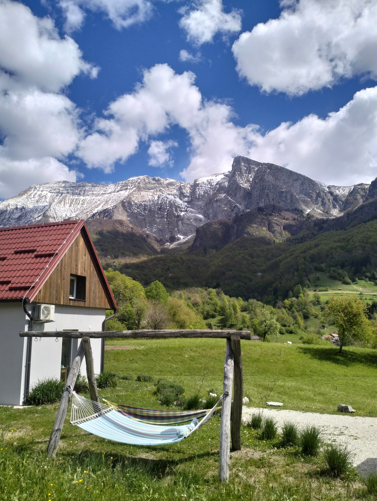 A small, 2022 built house in peaceful street, 5 min walk to center of Bovec. It has it`s own garden and 35m2 private patio with table, chairs, 2 deck chairs and big transparent roof for you to enjoy it even if it rains! It has an upstairs bedroom with big bed (180x200) and on the ground floor a sofa bed (140x200). The kitchen has all essentials appliances like dishwasher, microwave, oven, kettle. The kitchen is modern, white high gloss. There is a modern bathroom with walk-in rain shower.
