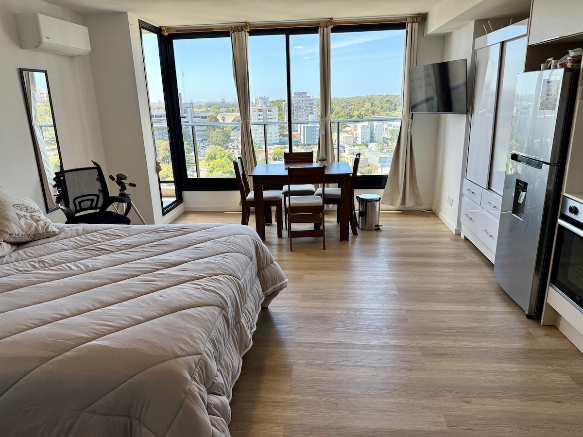 Relaxe neste espaço tranquilo e elegante. Desfrute de uma vista única de Punta del Este. Tem um quarto (aberto), um banheiro, cozinha equipada, ar condicionado, Wi-Fi, smart TV, etc. uma base de cama de 2 lugares e 2 colchões de solteiro. Os melhores serviços; incluindo piscina interior e exterior, churrasqueira, garagem, micro-cinema, ginásio, jogos ao ar livre para crianças, quartos (crianças, adolescentes e adultos) Pergunte-me.