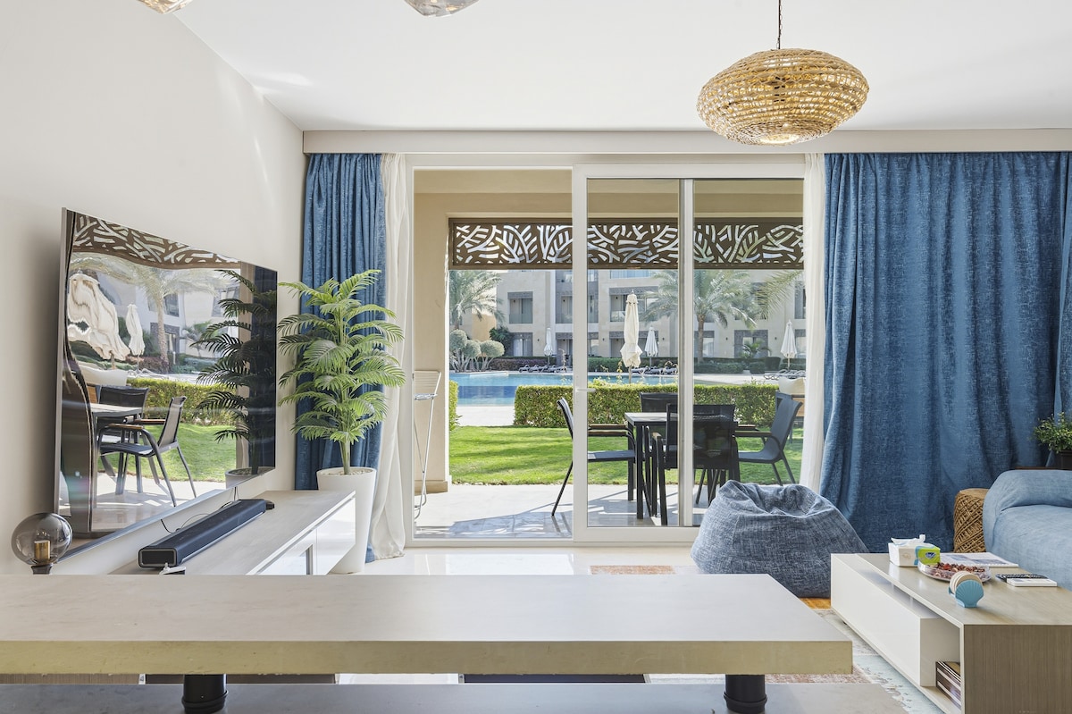 Um apartamento aconchegante de 1 quarto, localizado no coração de El Gouna (Mangroovy - o único complexo à beira-mar) com vista para a piscina e acesso gratuito à praia. É um apartamento no piso térreo com uma cozinha totalmente equipada, 2 banheiros e uma sala de estar. Há um terraço ao ar livre iluminado e aconchegante, perfeito para o seu café da manhã ou relaxamento tarde da noite. Também dispõe de uma Smart TV, máquina de lavar roupa, máquina Nespresso, chaleira e micro-ondas. O apartamento é ótimo para casais e famílias pequenas.