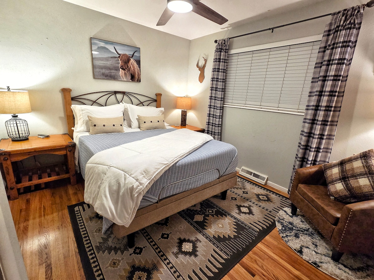 Esta propriedade consiste em três apartamentos de luxo que podem ser alugados individualmente. No primeiro andar, uma unidade de dois quartos/dois banheiros acomoda até cinco pessoas. No segundo andar, há duas unidades de um quarto/um banheiro que acomodam até três pessoas. Este anúncio contém informações para reservar o apartamento 2º andar oeste. A sala de estar apresenta portas francesas que se abrem para um deck de sequoia vermelha brasileira com belas vistas do sopé do Pikes Peak. Um lugar inspirador para desfrutar de café da manhã ou café. O romântico...