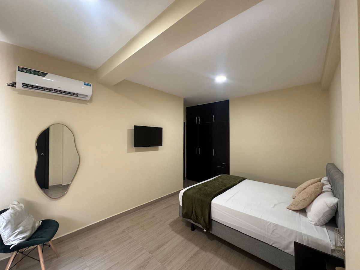 O apartamento é independente, mobiliado, confortável, muito iluminado, limpo, de fácil acesso. Você pode compartilhar uma área externa de jardins e estar, sob as árvores. A localização é estratégica: a duas quadras do Mall del Pacifico e a duas quadras da praia El Murciélago. Conecta-se com a Avenida Flavio Reyes, que tem bares, restaurantes, igrejas, supermercados, farmácias, cabeleireiros e amplas calçadas para caminhar. O setor é seguro e equidistante do centro da cidade.