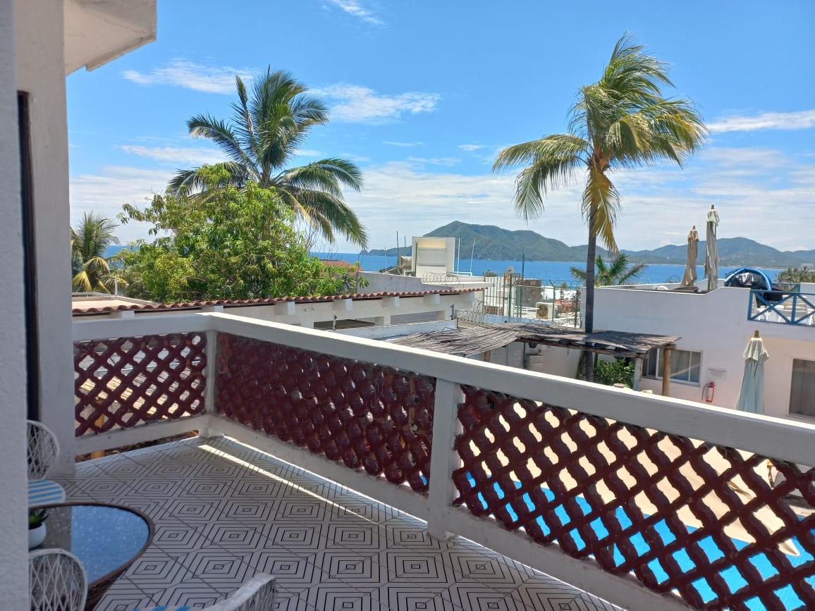 Renta de departamento en Manzanillo, 2do nivel, vista al mar, 3 cuartos, el principal con cama king y baño completo, cuenta el cuarto con ventana hacia el mar. El segundo cuarto con 2 camas individuales y con ventana hacia el mar, el tercero es pequeño y cuenta con una cama matrimonia, todos los cuarto tienen aire acondicionado. Otro baño completo común, cuenta con sala y comedor con un balcón con vista al mar, también aire acondicionado en el área común, tiene cocina pequeña pero con todo.