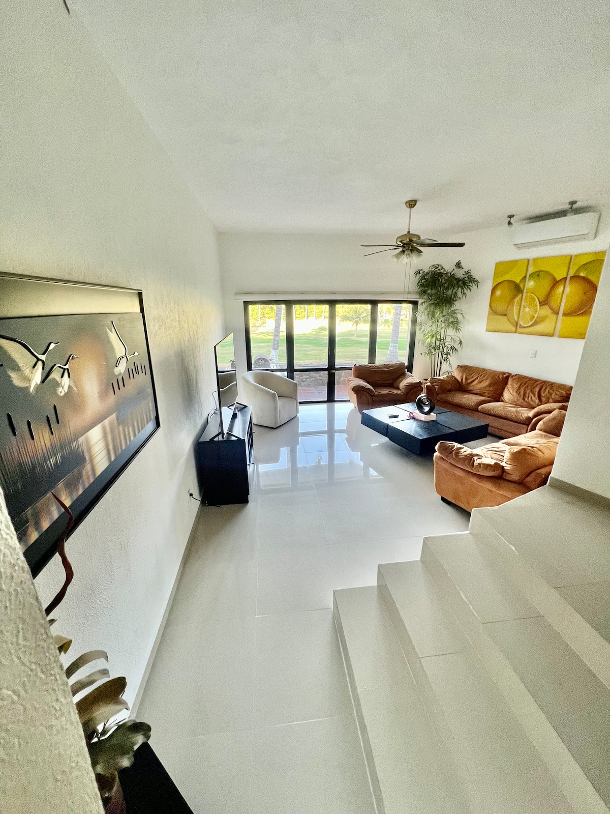 Moradia moderna, tranquila e totalmente mobilada com 3 quartos e 3 casas de banho, localizada no Condomínio Villas del Palmar, com segurança 24 horas por dia, 7 dias por semana e vista espetacular para o campo de golfe. Um total de 6 piscinas, incluindo 1 piscina de borda infinita com vista inesquecível para a Baía de Manzanillo, a apenas 2 minutos a pé do Beach Club.