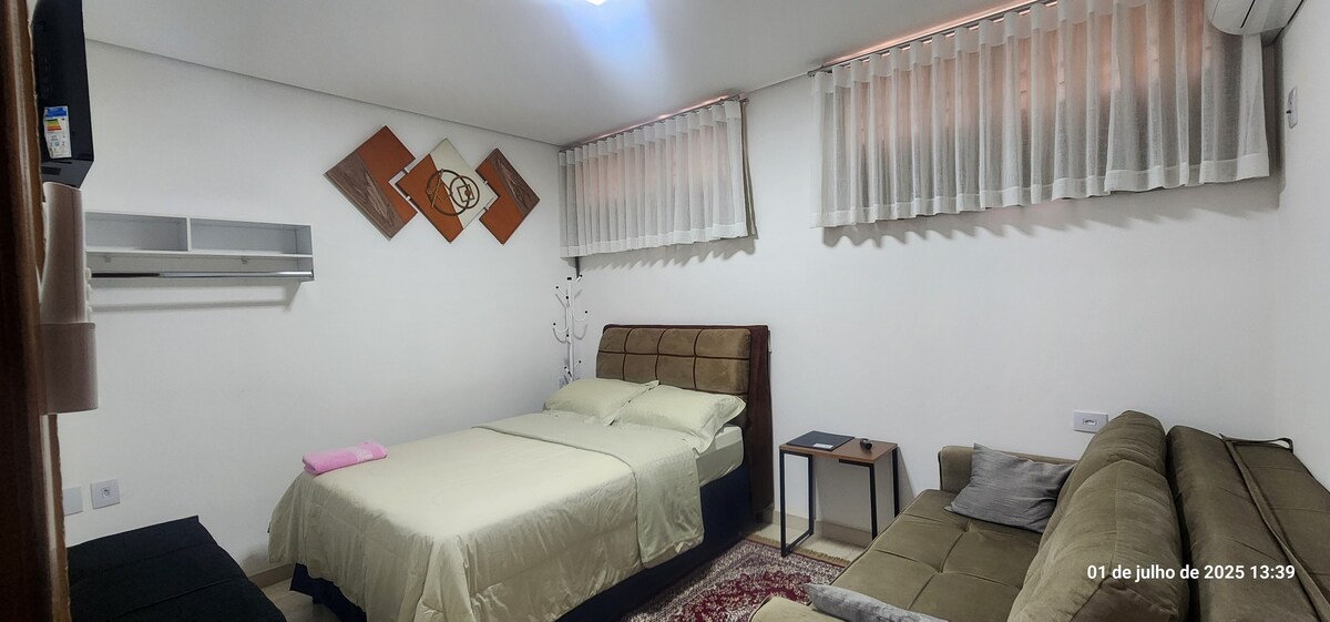 Desfrute de um ambiente aconchegante: Quarto com ar condicionado, tv com canais abertos, Netflix, Youtube, cama de casal e um confortável sofá-cama para você usar como sofá ou como cama. Cozinha e Lavanderia completa(ver itens em "comodidades"). Banheiro= Se destaca pela beleza e qualidade com um bom chuveiro para seu Banho. Garagem para 1 carro com portão eletrônico. Estaremos à sua disposiçao para atender você e sua família. Venha com a gente.