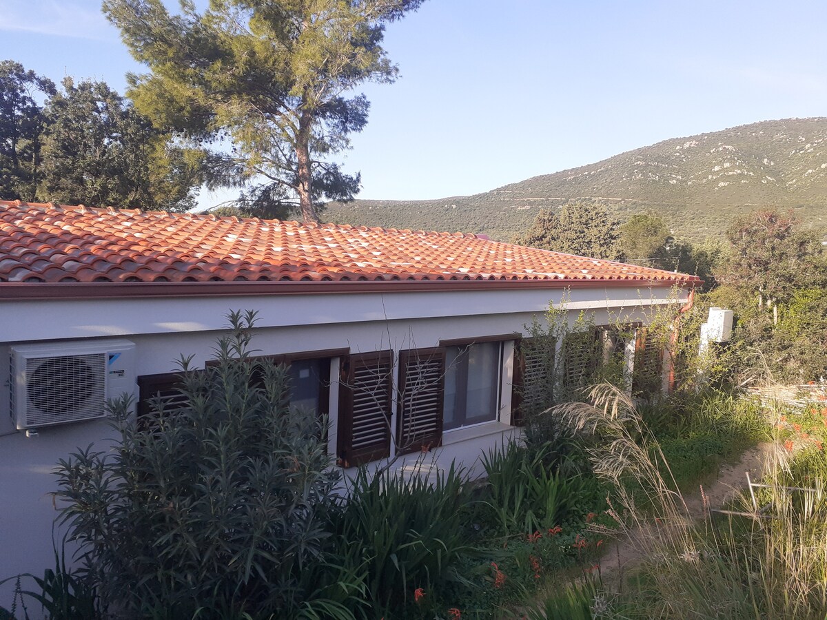 On the hill 10min. walk to the sea. Panorama of the gulf of Cagliari. From the villa and the garden you can always see the sea. from which you can enjoy fantastic sunsets. The house with a 1500m private garden is part of a luxurious and quiet condominium of villas surrounded by olive trees and Mediterranean scrub. The garden of the house has areas for eating and relaxing in the shade in complete privacy.