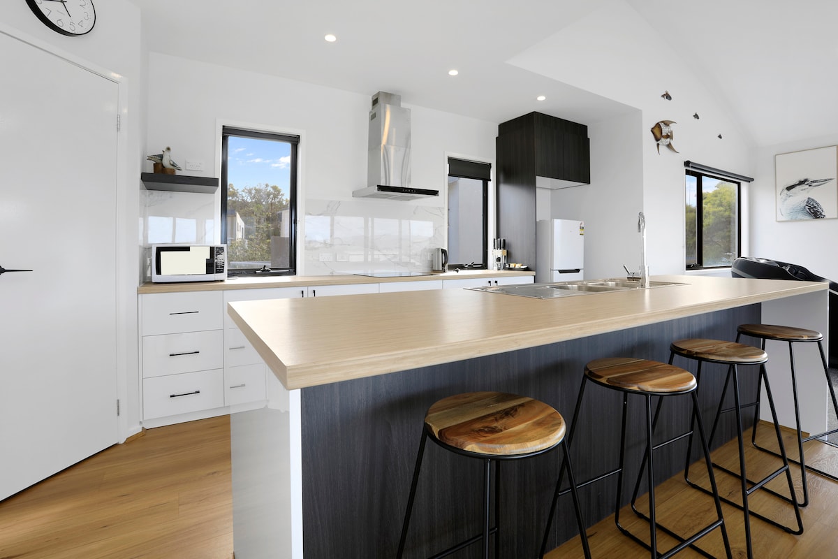 Don't book a bed, book an experience!! Sit back on the deck and enjoy views of the whole Apollo Bay valley and ocean. Watch the cows come home, whilst being ideally located close to the beach and shops. Relax during your time in Apollo Bay at The Cottage with beautiful light modern decor, vaulted ceilings and quality finishes thru out. Stone and brushed brass feature in the kitchen, with amazing picture windows capturing the superb views of the surrounding hills, ocean and farm life.