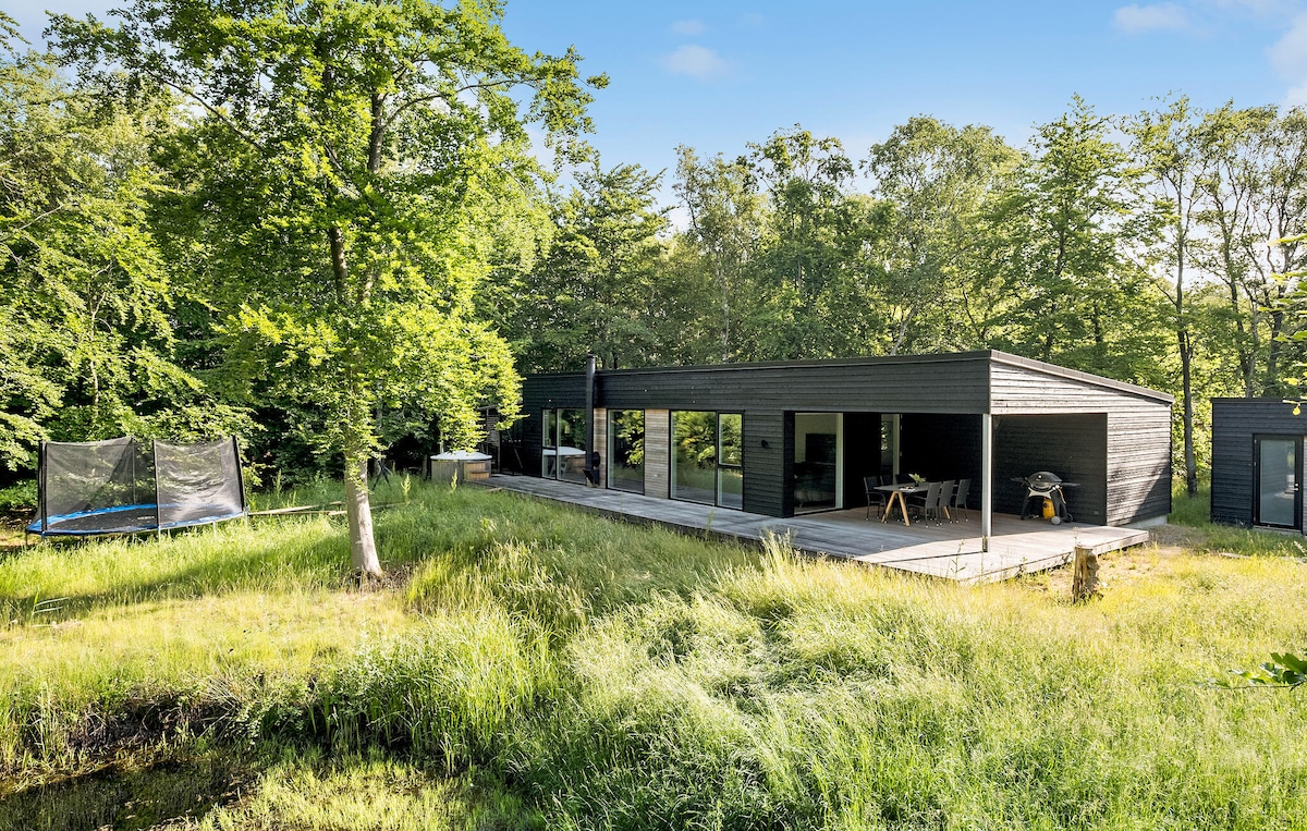 Moderne sommerhus i en perfekt kombination af komfort, aktiviteter og naturskøn beliggenhed. Der er plads til både afslapning og sjove stunder - alt sammen omgivet af en ugenert grund, kun 500 meter fra stranden. Nyd godt af vildmarksbad, jacuzzi, sauna eller aktiviteter som bordfodbold, dart eller brætspil. Udendørs kan gode stunder nydes under åben himmel i al slags vejr grundet den store overdækket terrasse. For de yngste er der sandkasse, trampolin, legetårn og rutsjebane.