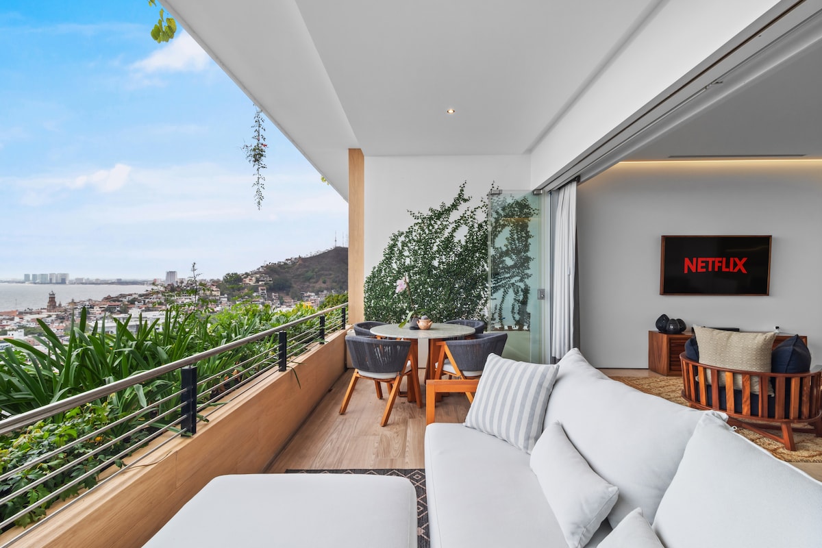 Vista para o mar, pôr do sol no terraço e o melhor de Puerto Vallarta à sua porta. Este moderno apartamento de 1 quarto fica no alto do 11º andar do luxuoso 105 Sail View, no coração da Zona Romântica — a três quarteirões da Playa Los Muertos. Saia para cafés, galerias, clubes de praia e vida noturna... depois volte para casa para vistas tranquilas, elevadas e arrebatadoras do Pacífico. Café da manhã na sua varanda, tardes na piscina de borda infinita, noites assistindo o sol derreter no oceano — flutuando acima de tudo.