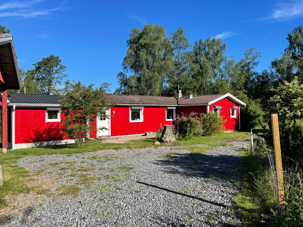 Cozy red wooden cottage on a hill, nestled at the edge of the forest with beautiful views of Västra Öresjön. Recently renovated, it features a warm, inviting atmosphere with a wood stove and an open kitchen. Fully equipped for comfort, this peaceful retreat is perfect for those seeking relaxation and nature. Enjoy the tranquility of the lake and surrounding forest in this charming getaway.