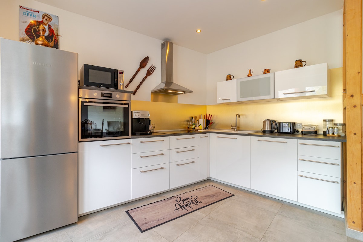 O whiteloft é um dos nossos melhores espaços que oferecemos no Airb&b desde outubro de 2022. O loft tem cerca de 130 metros quadrados, com pé direito de 5,5 metros 50% da área é projetada apenas para bem-estar e estar. Banheira, sofá-cama, chuveiro em espiral para 2 pessoas e lareira de madeira verdadeira não deixam nada a desejar. No verão, um portão de 5x4 metros pode ser aberto, o que transforma a área inferior do loft em um conversível. A grande cozinha americana e o bloco são adequados para eventos A geladeira para vinhos, o fogão a gás e a placa de cerâmica fazem parte do equipamento