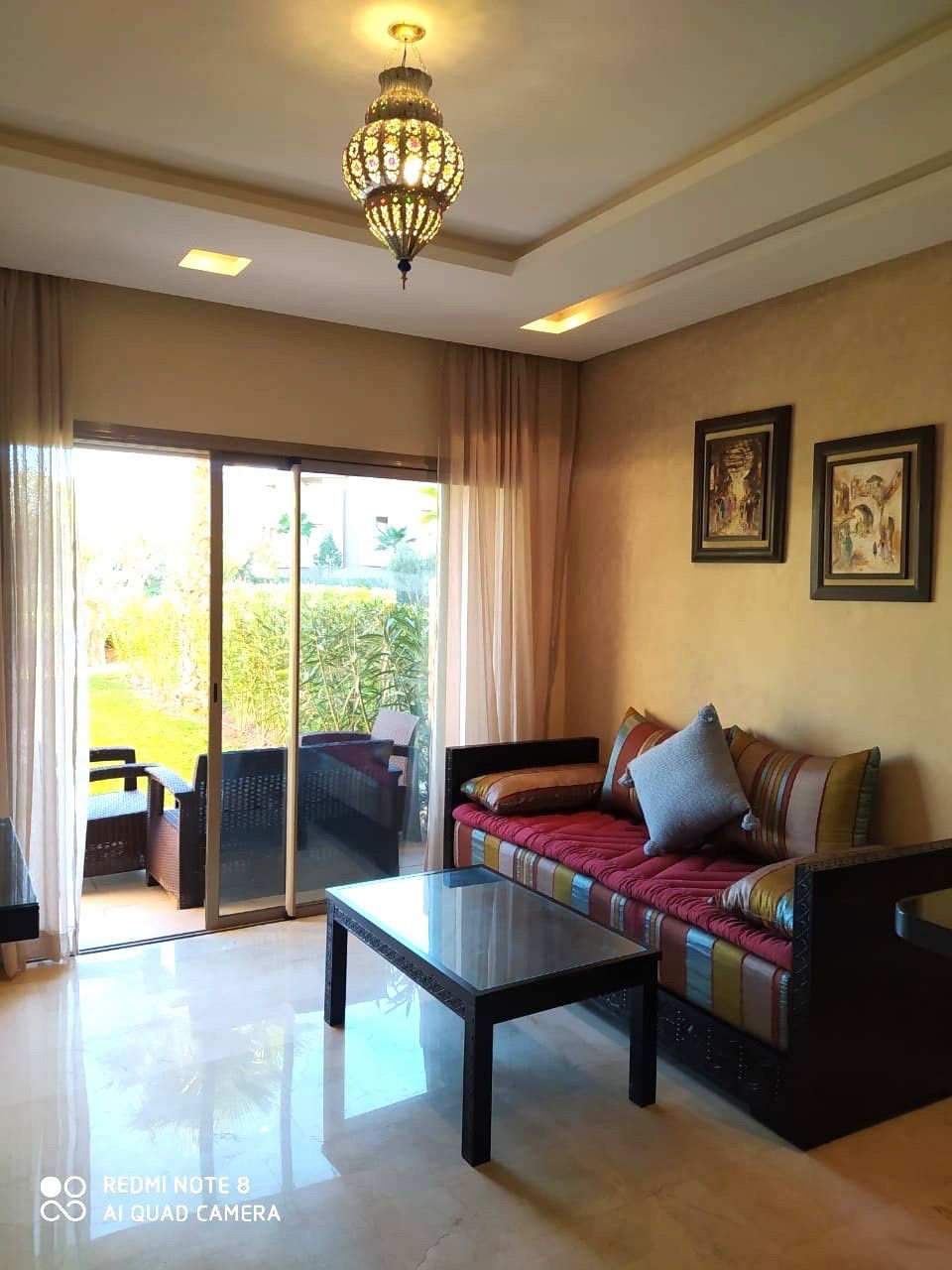 Appt 2 pièces - 52 M2 pour 4 personnes en Rez de jardin dans l'une des plus prestigieuse résidences golfiques de Marrakech. Vous serez au coeur d'un cadre de verdure avec une piscine équipée de transats ainisi que d'un bassin pour les enfants. Vous aurez a disposition un salon aménagé d'un canapé - lit avec espace TV ainsi que d'un bar de séparation avec sa cuisine entièrement aménagée et équipée, une chambre avec un lit double 140, WC, un coin repas ext, un barbecue, une table de tennis, Wifi..