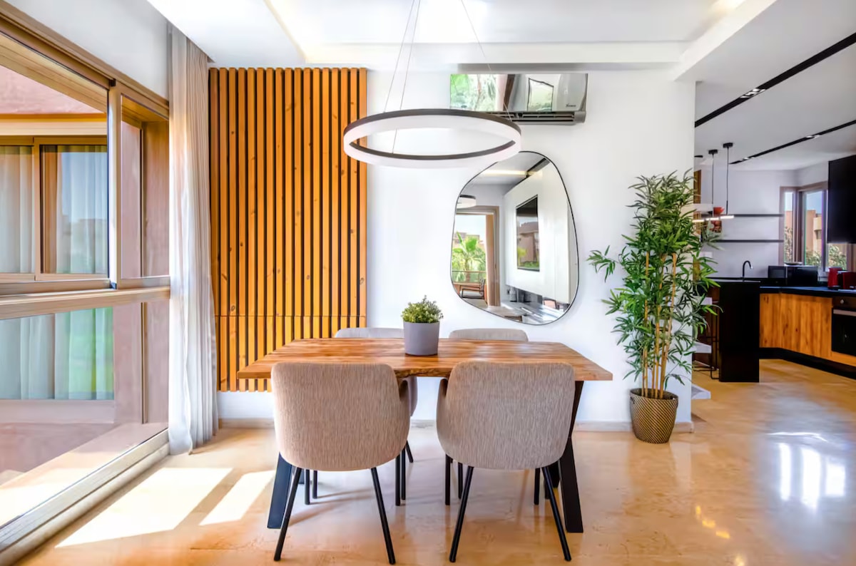 Desfrute de uma estadia excepcional em um campo de golfe de prestígio, combinando calma e requinte ao pé da Cordilheira do Atlas. Este apartamento elegante tem um jardim privado e acesso direto à piscina, para momentos de relaxamento em total privacidade. Com ar condicionado e totalmente equipado, garante o conforto ideal em um ambiente sereno e luxuoso. Perfeito para famílias ou amigos que procuram tranquilidade e elegância. 3 min de distância: Aeroporto 5 minutos para a M Avenue 2mn: Carrefour