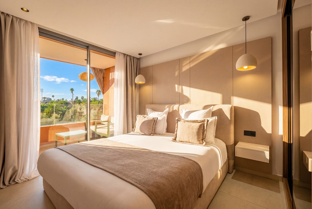 Apartamento Premium de 130m2 com vista aberta para os Jardins Majorelle. Localizado no 5º e último andar, sem vistas, oferece uma sala de estar de 60 m² aberta para o terraço, uma banheira de hidromassagem de 4 lugares, uma cozinha Bosch altamente equipada, fibra óptica de 100 Mb, TV Sony 75" 4K e sistema de som Bose. A 10 minutos a pé do centro de Guéliz, a 15 minutos do Hivernage. Luxo, calma e conforto.