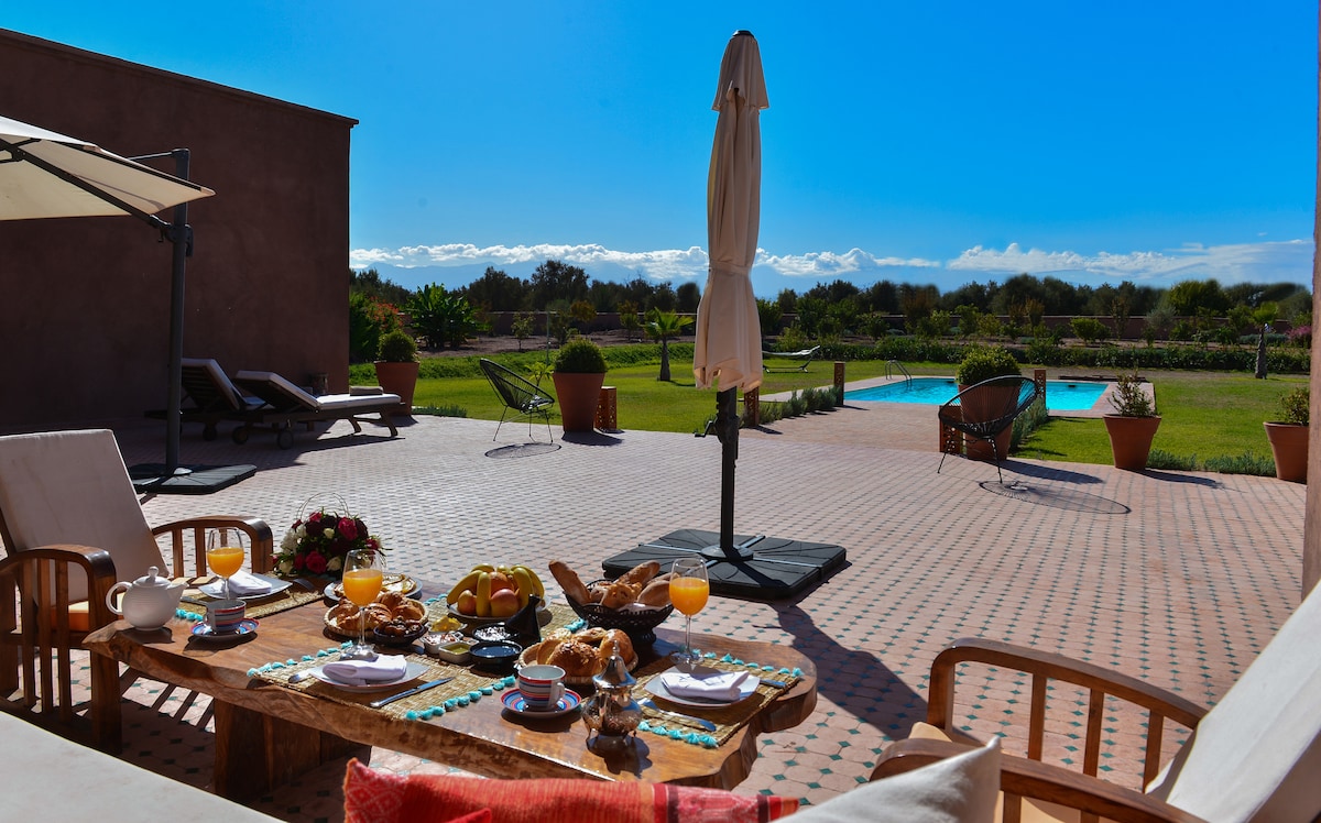 Quando você descobrir este lugar, localizado de frente para o Atlas e a 15 minutos de Marraquexe, uma sensação de bem-estar irá invadir você, pois aqui tudo é "orgânico" e a qualidade da sua estadia continua sendo nossa prioridade. Para os golfistas, 7 campos de golfe em 10 minutos, incluindo o campo de Samanah, a 5 minutos de distância. A moradia é composta por 5 quartos muito confortáveis, uma piscina 12x6, todos em um hectare de terra arborizada, árvores frutíferas e um olival.