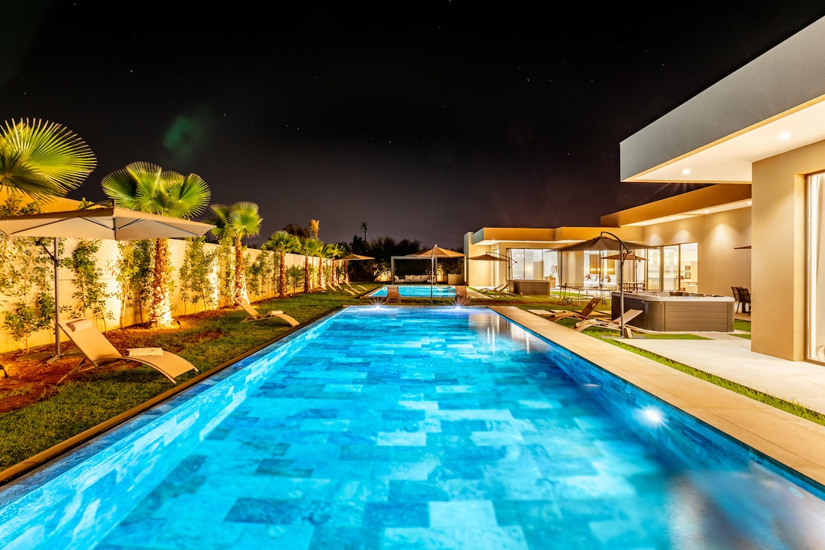 Privatisation complète jusqu’à 22 pers. Villa de luxe avec grande piscine chauffée à débordement & jacuzzi. 6 grandes suites climatisées & chauffées toutes avec TV, minibar, café, etc... Idéale pour séjours & petits événements : avec danseuses orientales, musiciens, cracheur de feu & +. Services premium : ménage quotidien, serveurs, majordome. Mini-foot, basquet, ping-pong... Coach sportif sur demande. Excellente cuisine marocaine maison. Transfert aéroport offert (1 vol). Tous transports 24/24