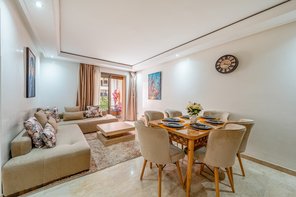 Lindo apartamento de 2 quartos localizado em Guéliz, Marraquexe. Com piscina interior, piscina no terraço, banho turco, sauna e ginásio, combina conforto moderno e bem-estar. Perto de restaurantes, cafés e lojas, é a base perfeita para explorar a cidade enquanto desfruta de um espaço de relaxamento refinado. Perfeito para casais, famílias ou viajantes de negócios que procuram conforto, estilo e uma localização central.