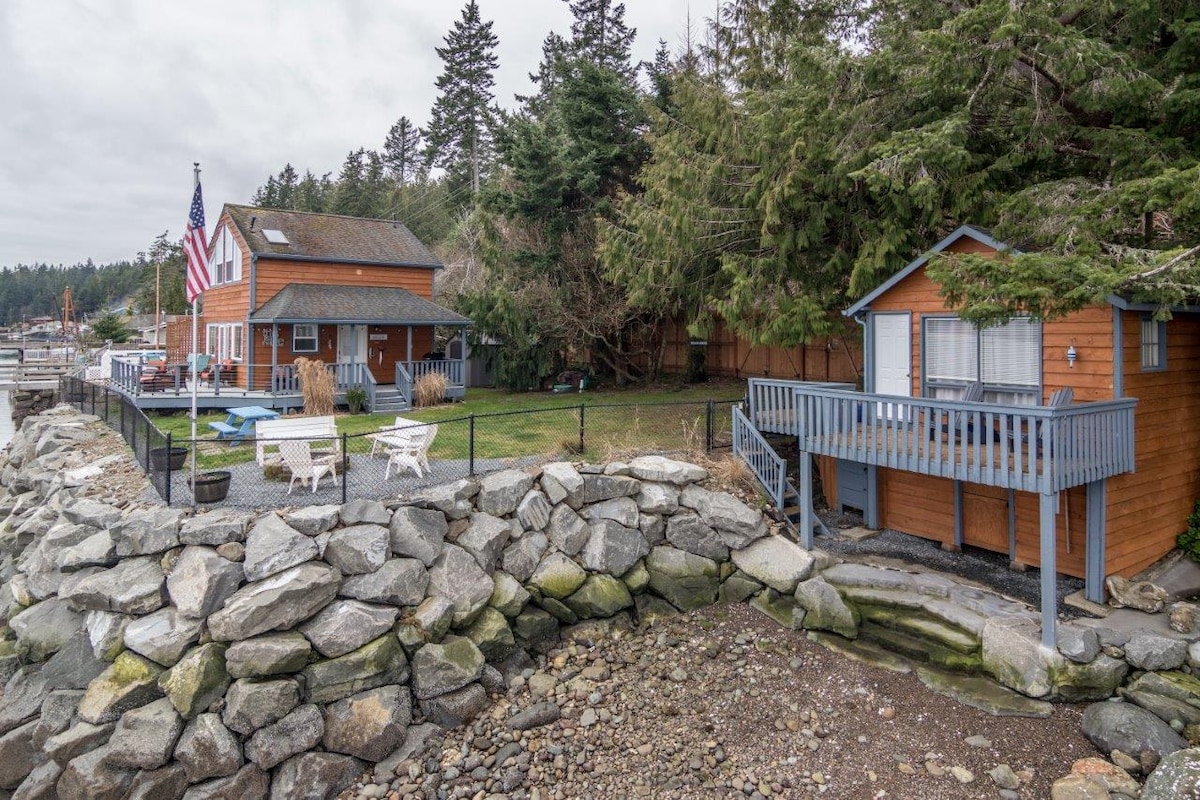 Casa à beira-mar com vista panorâmica incrível para Stretch Island (uma ilha com ponte.) Um refúgio tranquilo e pacífico, esta bela e única casa de um andar oferece vistas para a água de todos os cômodos. A grande marquise de cedro é perfeitamente aconchegante, não importa o clima! Desfrute de uma fogueira à beira-mar e S'mores, apanhe o pôr do sol e observe as estrelas em uma extensão aberta de céu. O pátio à beira-mar tem uma tigela de fogo a lenha. As redes à beira-mar convidam você a relaxar e ouvir as ondas batendo.