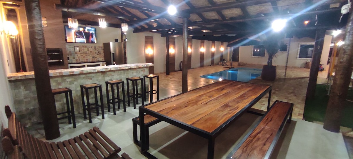Casa no centro de Matinhos, a 700 metros do mar, com piscina privativa aquecida a 36 °C e área gourmet com churrasqueira. Recebe até 12 hóspedes, com melhor acomodação para 8, roupa de cama incluída e ambientes que atendem bem famílias, casais e grupos de amigos. A distribuição inclui 1 suíte com ar-condicionado, 2 quartos, sala com Smart TV, cozinha equipada, garagem para 4 carros e opção pet friendly, em um espaço pensado para reunir família e amigos perto da Praia Brava e do pico de surf.