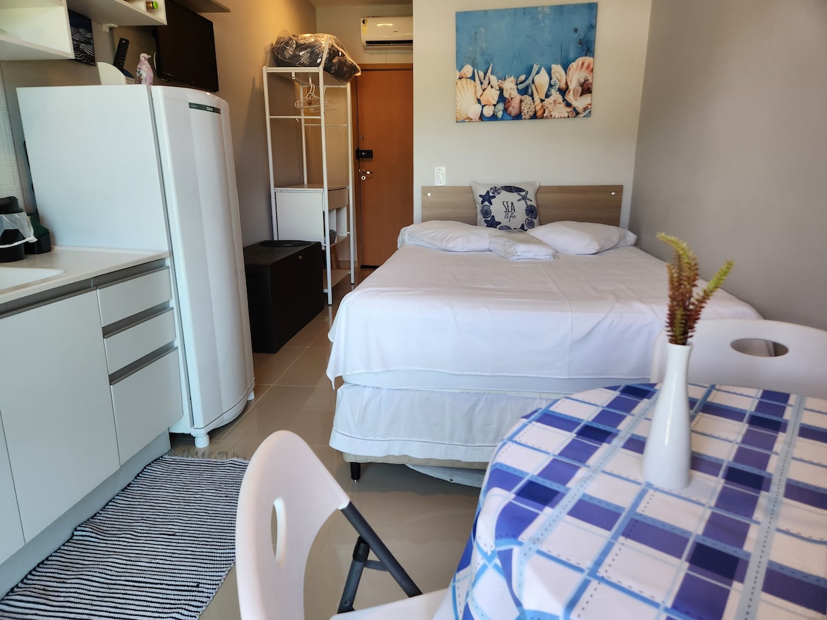 Studio Sal e Sol Em condomínio beira mar 🏖️ 23 metros quadrados Ar condicionado Fechadura Eletrônica Wi-fi Tv smart Ventilador Cama casal Cama aux solteiro Mesa e duas cadeiras Frigobar Fogão Microondas Cafeteira Sanduicheira Utensílios de cozinha Máquina de lavar roupa 2 cadeiras de praia Grelha/espetos 🚨IMPORTANTE: Roupas de cama e banho não são oferecidos! Condomínio fechado com: Ducha pós praia, elevador, vaga para estacionamento. 🌅Terraço com vista maravilhosa para o mar