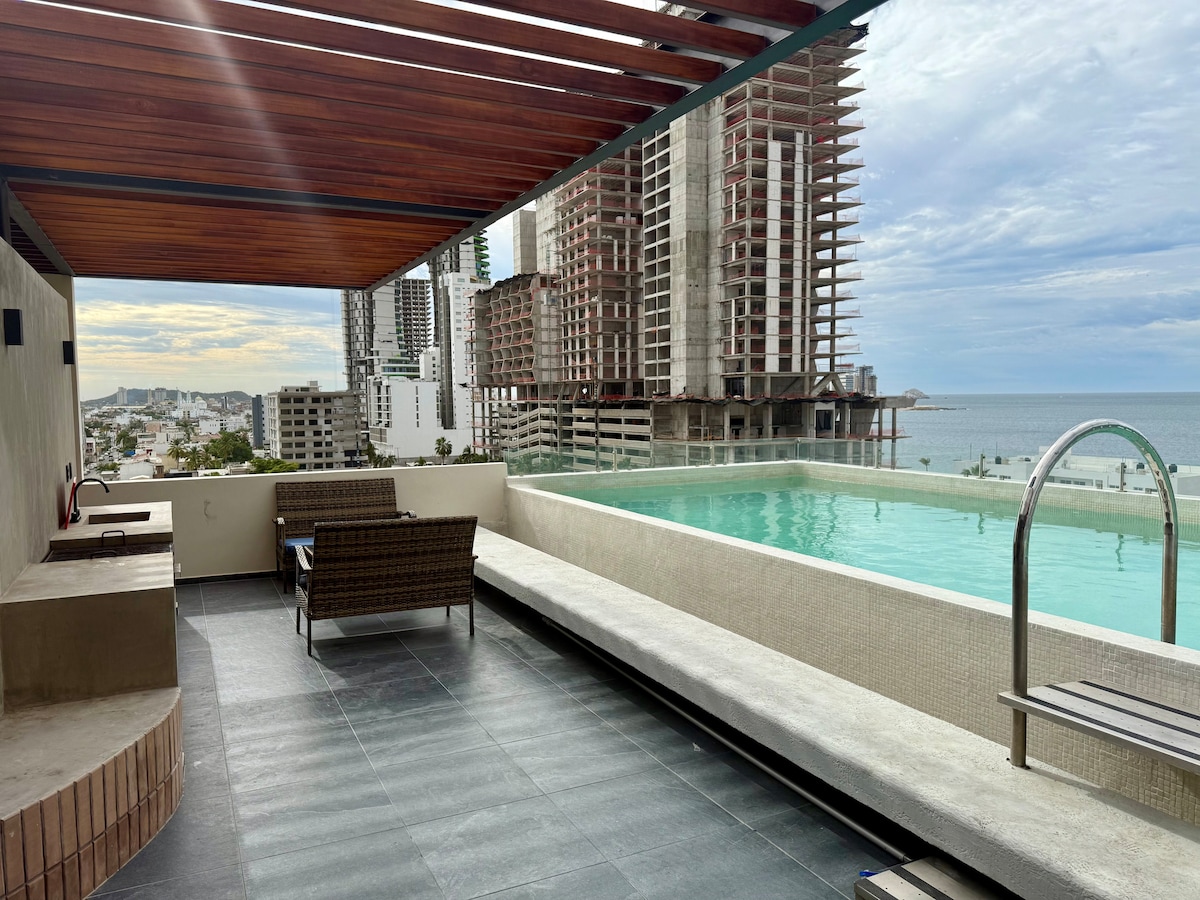 Acorde à beira-mar no The Grand O Living, um espaço elegante e acolhedor projetado para fazer você relaxar. Café ao nascer do sol no terraço, entardeceres dourados da sala de estar. Localizado no Malecón, a apenas 50 m da praia, com piscina em estilo resort, academia e áreas de lounge. Ideal para casais e famílias que procuram conforto e vista para o mar. 2 min para Mazatlán Letters 5 min para o Novo Aquário 4 min do Estádio Teodoro Mariscal