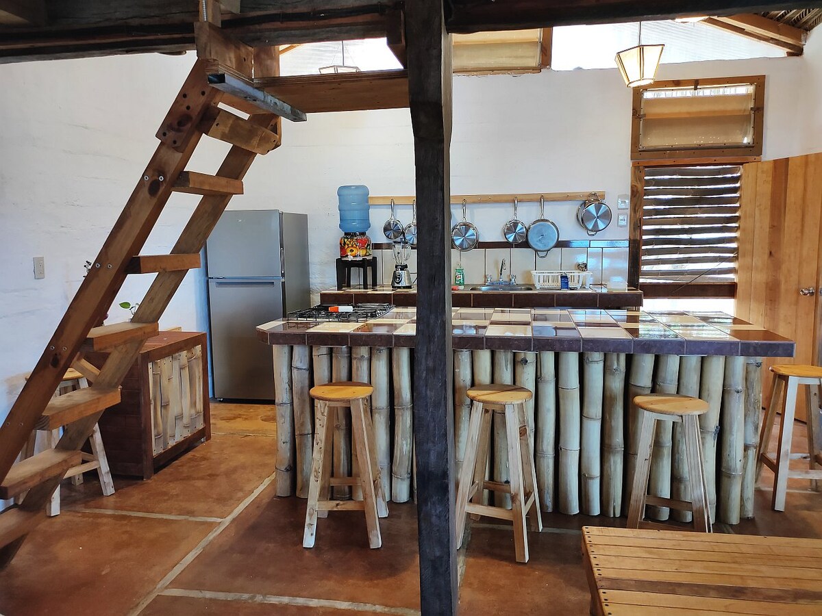 Acordar neste lugar é um sonho! A casa fica bem à beira-mar para desfrutar dos melhores pores do sol todos os dias. Tem dois níveis. O quarto está no topo, bem como o espaço de trabalho (Starlink) e redes para descansar. O teto é uma ótima palapa. A casa tem uma pequena piscina privativa de onde você pode desfrutar da melhor vista sobre Playa Mermejita. A casa é muito aberta para desfrutar da frescura do vento e das melhores vistas.