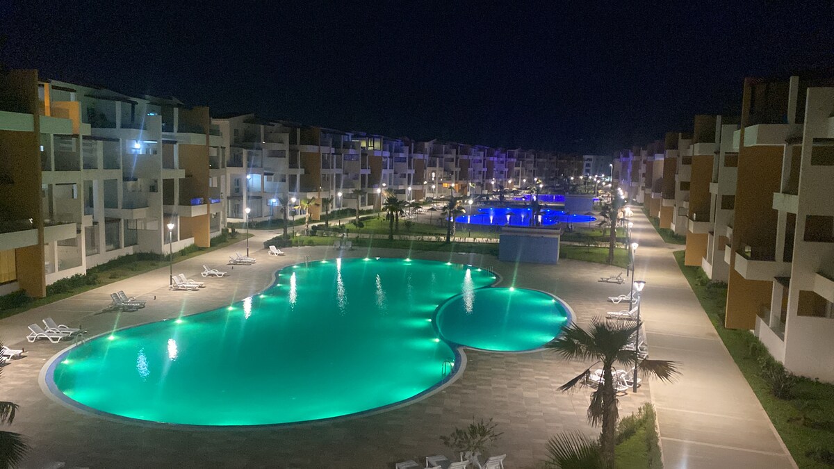 Incrível apartamento de 3 camas com todos os confortos modernos totalmente mobiliados com acesso a 7 ótimas piscinas, academia externa, área de jogos para crianças, estacionamento privado 24 horas de segurança totalmente isolado, Wi-Fi gratuito, este apartamento vem com vistas deslumbrantes para a montanha, a uma curta distância a pé da praia, este apartamento está localizado no norte de Marrocos.