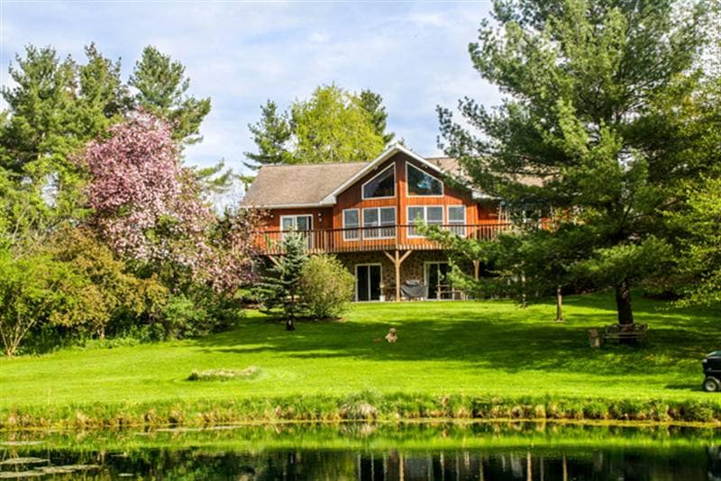 Experience luxury at Barn Manor, a converted barn surrounded by fields and forests. Relax in a jetted tub with heated floors, enjoy fireside evenings, and admire custom woodwork, marble accents, indoor hammock and unique windows. Both levels are open floor plans: the first floor has a queen bed, full kitchen, living space, and bathroom; upstairs offers a king bed with Casper mattress, queen futon, and optional fold-out twin. Sleeps up to 8. Ask about long-term winter stays.