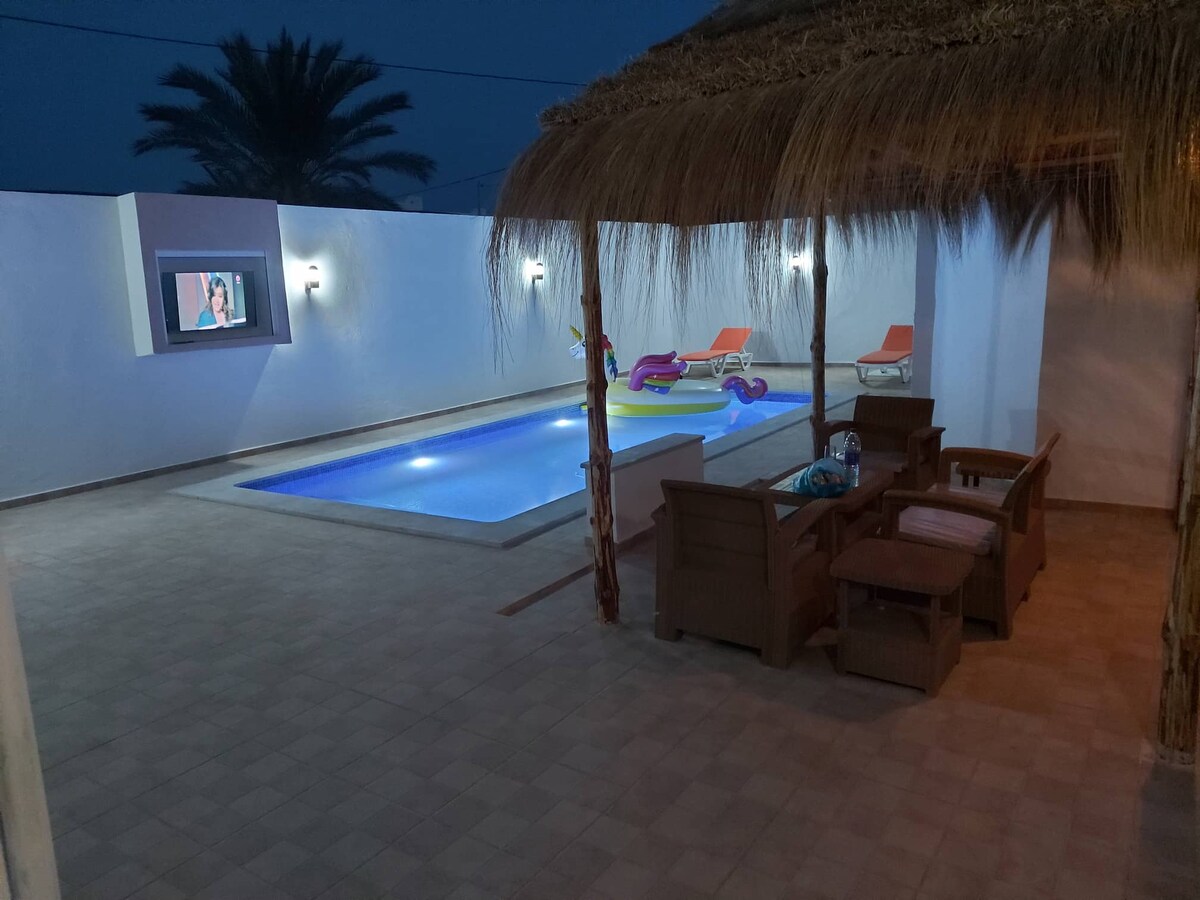 Bem-vindo à nossa vila sem vizinhos, virada para o sul, em uma área tranquila Ela tem uma grande piscina privada, uma piscina infantil, uma grande sala de estar, uma cozinha equipada, uma área de pérgula para relaxar, um churrasco, um canto aconchegante... Jogos de tabuleiro estão disponíveis para entreter você A 200 m da mesquita, e de carro: a 2 minutos do supermercado, a 5 minutos da praia e a 15 minutos do centro da cidade de Midoun e do shopping Bourgo Mall O carro é altamente recomendado