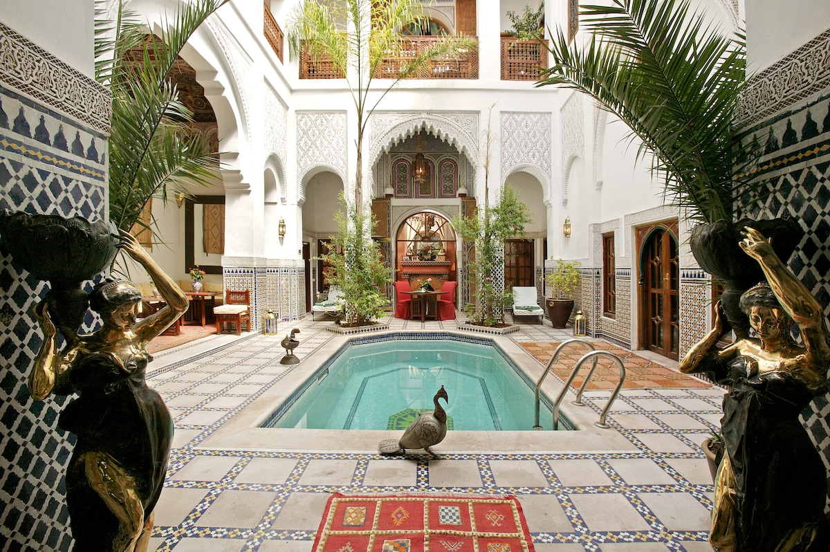 The Scheherazade Suite. Escape to a charming boutique hotel riad in the heart of the Medina, just a short walk from Jemaa El Fna Square. Immerse yourself in pure Marrakchi tradition, with elegant decor, air-conditioned rooms, fast WiFi, and a refreshing plunge pool. Enjoy daily breakfast & housekeeping, plus a stunning rooftop terrace for evening drinks and dinner under the stars. A peaceful retreat with all modern comforts—book your authentic Marrakech experience today!