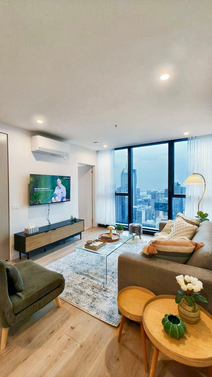 Luxury and modern designed apartment, which is a residential opportunity above and beyond anything yet seen in the Melbourne CBD. Walking distance to everywhere, supermarket just downstairs, restaurants around. Most convenient location in CBD. We provide high quality beds and mattress, hotel level bedding. Miele brand oven and gas stove. Smart tv and comfortable environment in living room. 2 bedrooms and 2 bathroom, suitable for family and friends.